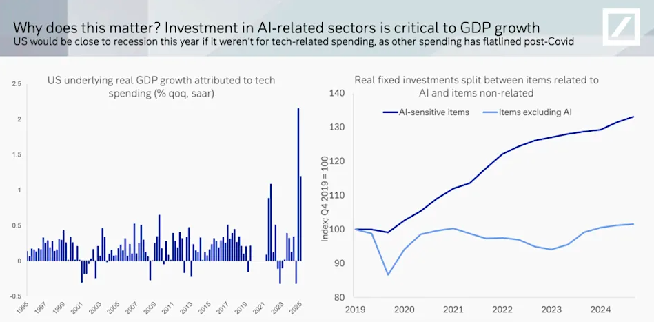 德意志银行在近期探讨人工智能是否存在泡沫的报告中表达了类似观点。德银分析师Adrian Cox和Stefan Abrudan写道,“人工智能相关领域的投资对GDP增长至关重要,若非科技相关支出支撑,加上疫情后其他支出停滞不前,美国经济今年就将濒临衰退。”
