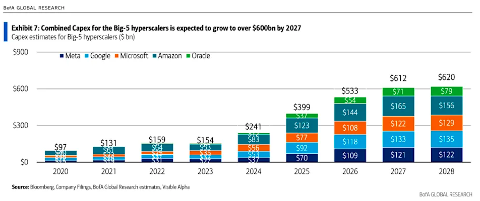目前,投入人工智能领域的资本支出规模极为庞大。据美银分析师Justin Post和Nitin Bansal估算,仅五家AI大厂(hyperscalers)——谷歌母公司Alphabet、meta、微软、亚马逊和甲骨文,今年的人工智能资本支出就将达3990亿美元,未来数年更将突破6000亿美元。