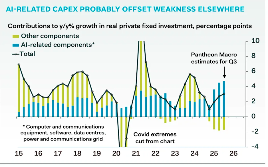 Pantheon Macroeconomics在最近的一份报告指出,衡量企业支出的私营固定投资几乎仅因人工智能相关支出而增长。分析师Oliver Allen发布的图表显示,除人工智能外的所有私营固定投资,实际上均呈下滑趋势: