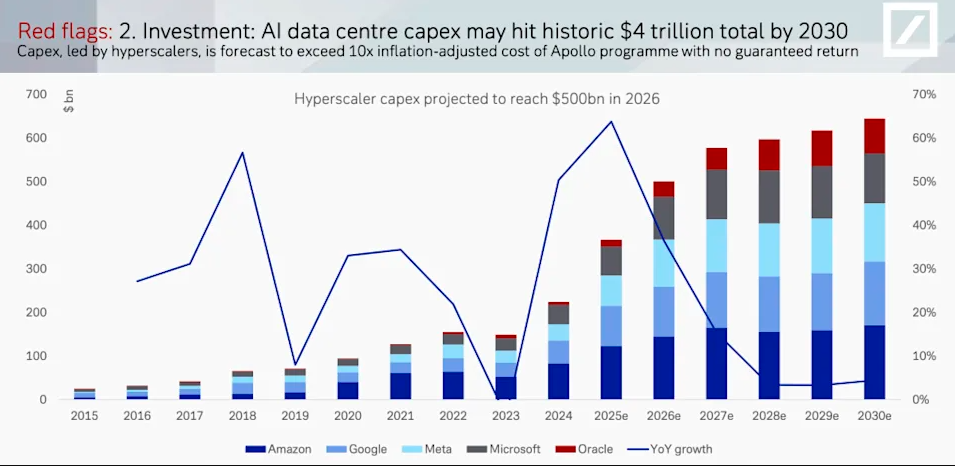 德意志银行数据显示,到2030年超大规模AI企业对人工智能数据中心的累计投资将达4万亿美元——远远超过1960年代美国登月计划的总成本:“相当于阿波罗计划经通胀调整后成本的10倍,且回报率无法保证。”