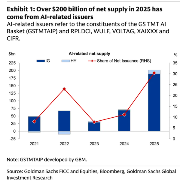 事实上,目前相关AI债务的规模已创下了历史新高。高盛分析师Spencer Rogers近期向客户指出:“2025年美元信贷市场中AI相关发行人的净供应量突破了2000亿美元,较去年总量翻倍有余。今年美元信贷净供应量的30%与人工智能相关。”