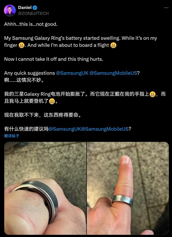 从帖子里的配图我们可以看到,他那枚三星Galaxy Ring智能戒指的电池仓部分明显肿胀、凸起,死死卡在他的手指上。我们可以从推文中得知他很疼,需要快速的建议。