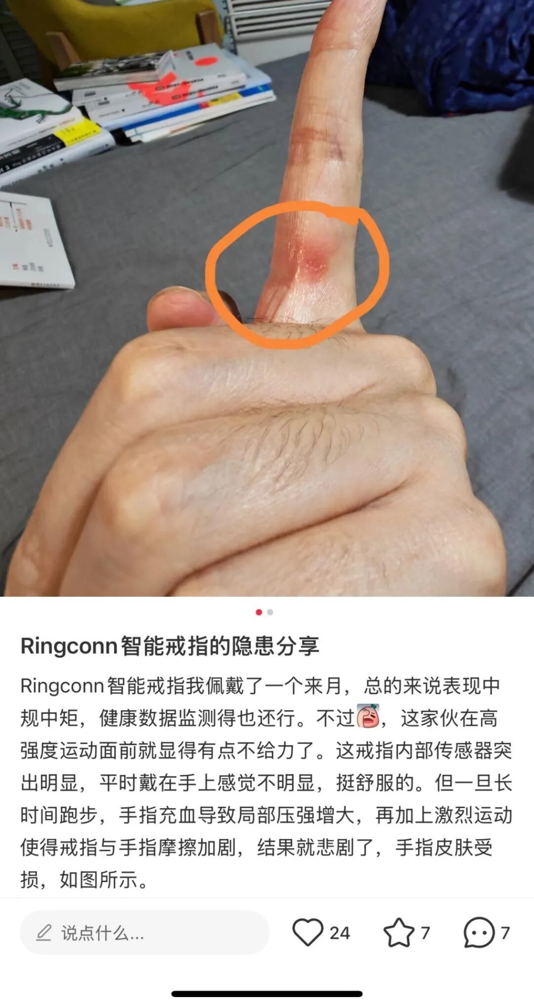 “Ringconn戴了一个来月,中规中矩吧……一旦长时间跑步,手指充血导致局部压强增大,再加上激烈运动使得戒指与手指摩擦加剧,就悲剧了。” 小红书用户奔研跑狗表示。