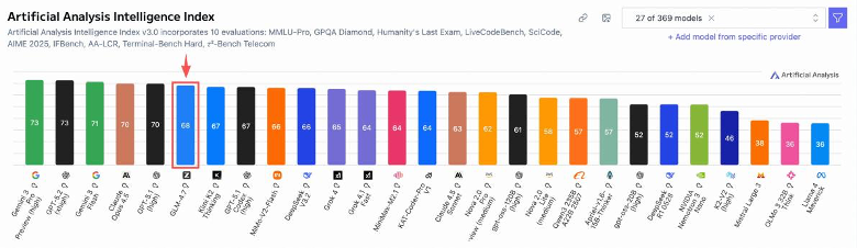 在模型能力持续扩展的基础上,智谱近期发布了GLM-4.7。在全球知名的权威大模型评测榜单“AA智能指数”中,GLM-4.7以68分综合成绩荣登开源模型与国产模型双料榜首。在全球百万用户参与盲测的权威编码评估系统Code Arena中,GLM-4.7位列开源第一、国产第一,超过GPT-5.2。