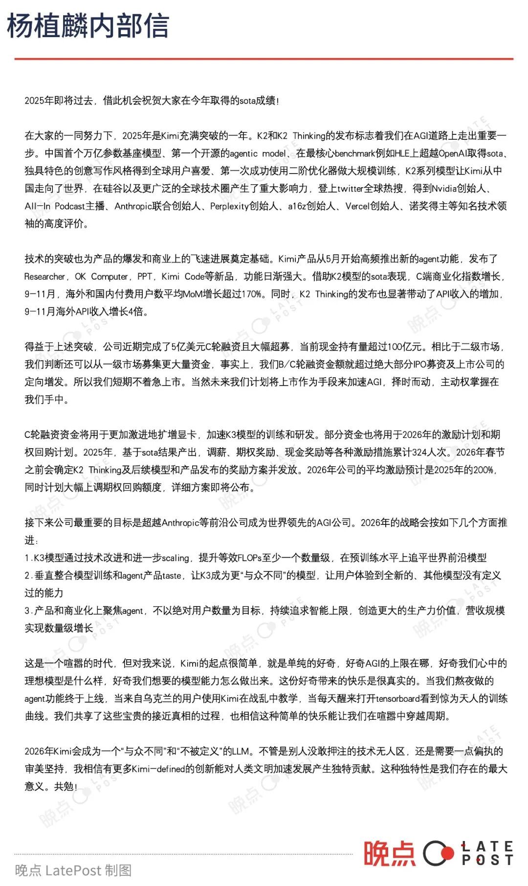 杨植麟在内部信中称,C 轮融资的资金将会用于更激进地扩增显卡,加速 K3 模型的训练和研发,并公布了 2026 年的重要事项: