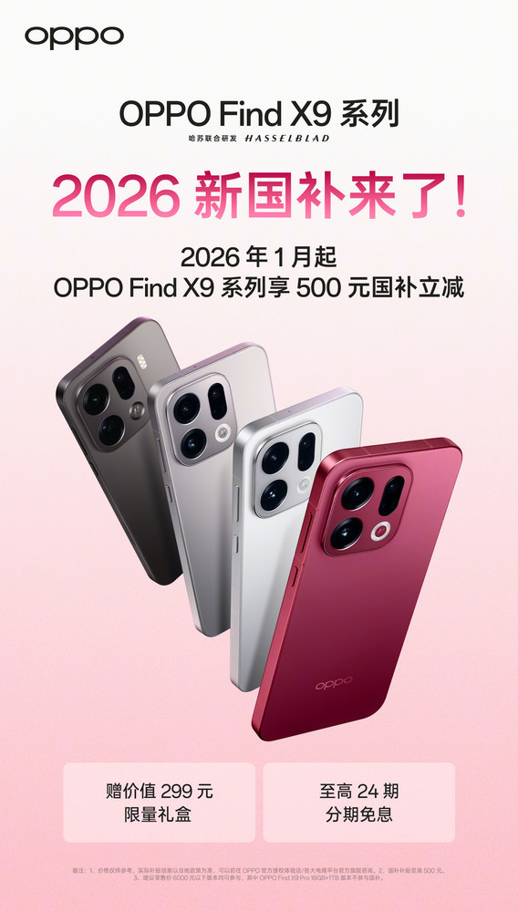 近日,2026年数码产品国家补贴政策正式发布,为消费者带来实实在在的优惠。12月31日,CNMO注意到,政策发布后,小米和OPPO等多家手机厂商迅速响应。小米宣布,领取国补购买指定小米产品,补贴至高可享6折。OPPO也表示,自2026年1月起,OPPO Find X9系列享500元国补立减,国补再加新年礼,购机赠299元礼盒,还享最高24期分期免息。相关国补政策,消费者可前往各平台咨询了解。