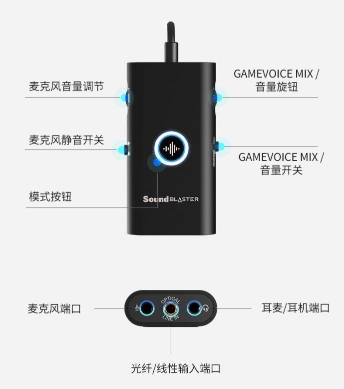 G6游戏声卡还具备强大的设备兼容性,能对PC、Mac、PS5、Xbox、Switch等多种电子设备兼容。在产品细节设计上,创新科技G6游戏声卡还配备了独立大旋钮、背光灯效,可以直观地查看输出音量大小,在不切屏的情况下对游戏声音快速调节。