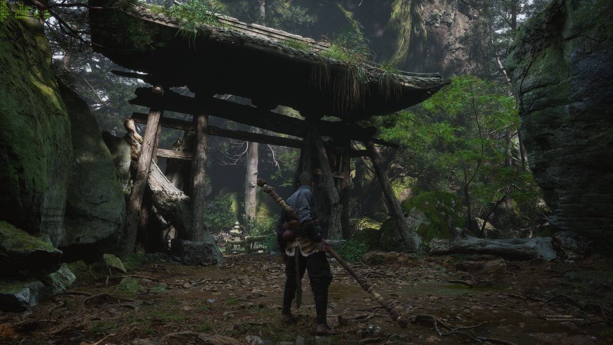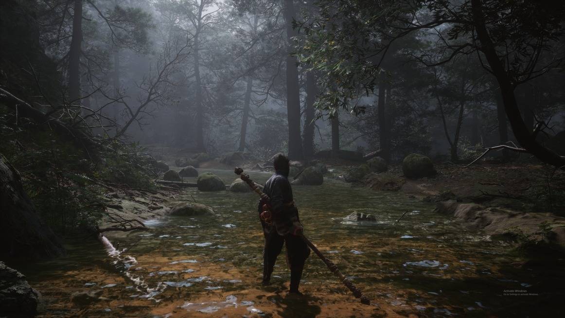 首关“黑风山”场景中,玩家所操纵“天命人”还未移动身形,近处小动物奔跑踩着落叶的声音,远处隐约的细碎蝉鸣,头顶林间松涛竹浪起伏的风声和环境中交互的各式音效作为背景音放在原本就植被茂盛亦幻亦真的游戏场景变得更难分真假。