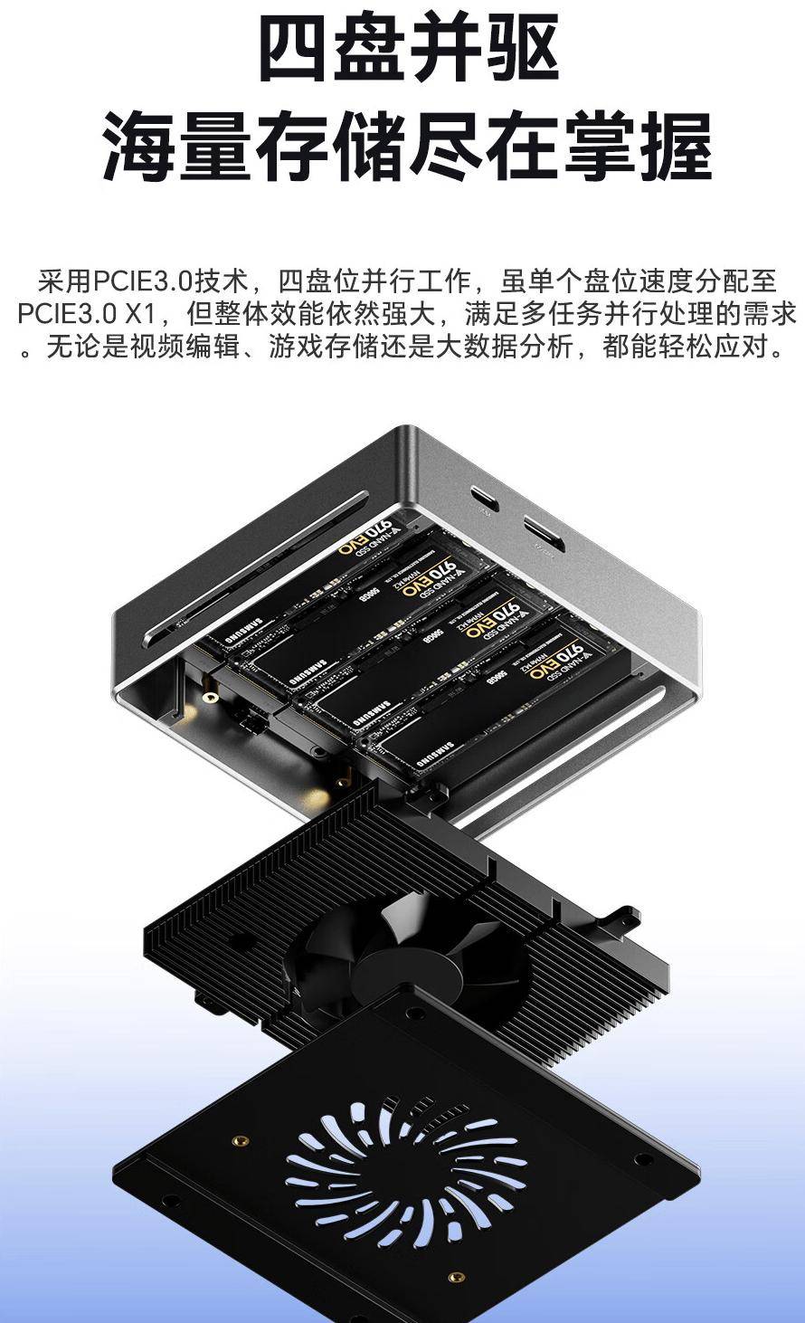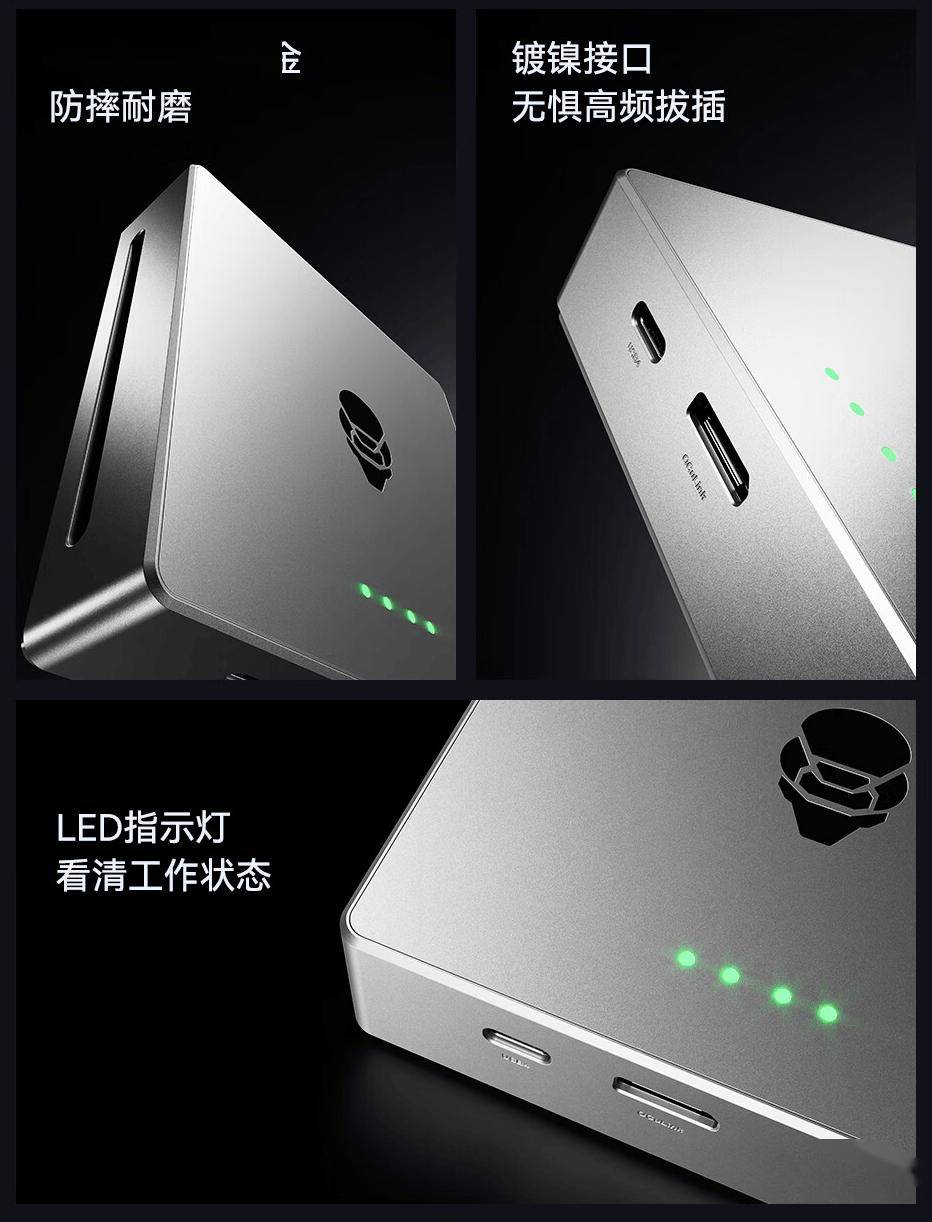 据介绍,这款硬盘盒采用 CNC加厚铝合金机身,内置LED指示灯,内置单风扇主动散热系统。