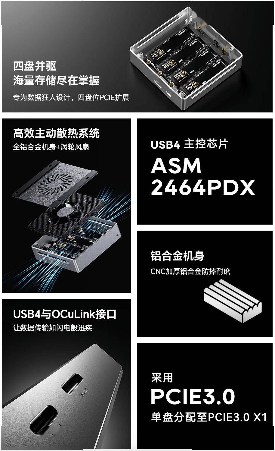 规格方面,该硬盘盒使用 ASM2464PDX主控芯片,采用PCIe 3.0技术,号称单盘传输速度至高800 MB/s,但仅兼容 USB4、雷电4、OCulink,不向下兼容USB 3.0/2.0。