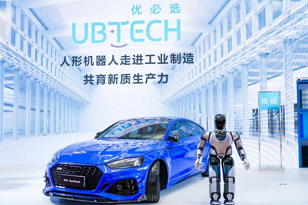 本届大会期间,人形机器人公司优必选首次公开展示了「人形机器人工业场景解决方案」,即在现场展示人形机器人在模拟车间质检、分拣、搬运等方面能力。其中一个环节里,就是优必选 Walker S 人形机器人对奥迪 RS5 的前后轮胎进行了质量检查。