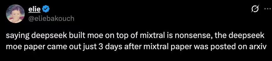 且不说 DeepSeek MoE 论文的发布时间和 Arthur Mensch 提到的 Mixtral 论文相差仅 3 天: