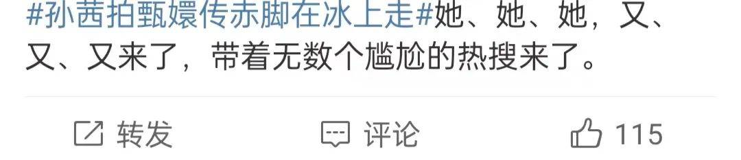 很快,孙茜拍《甄嬛传》赤脚在冰上走就登上了热搜,但是评论区不太乐观,不少人吐槽,觉得热搜很尴尬,孙茜的口碑并不算好。