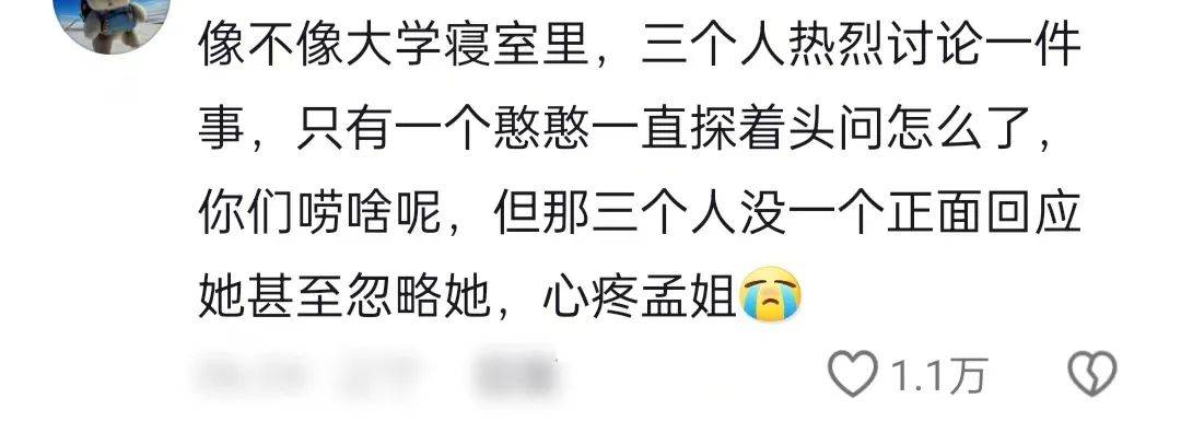 那期节目播出后,沈月单依纯李雪琴都被吐槽了,不少网友说她们抱团“孤立”孟子义,代入一下如果是在学校的四人宿舍,三个人讲话不理另一个人,真的挺难受的。