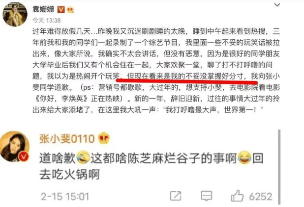 张小斐火了后,袁姗姗发文向她道歉,承认当时说话没分寸,张小斐留言称“道啥歉啊,回去吃火锅”,她已经原谅了她。但很多网友还是因此不喜欢袁姗姗,质疑她是过来蹭热度的,假如张小斐不红,她不一定会发文道歉。