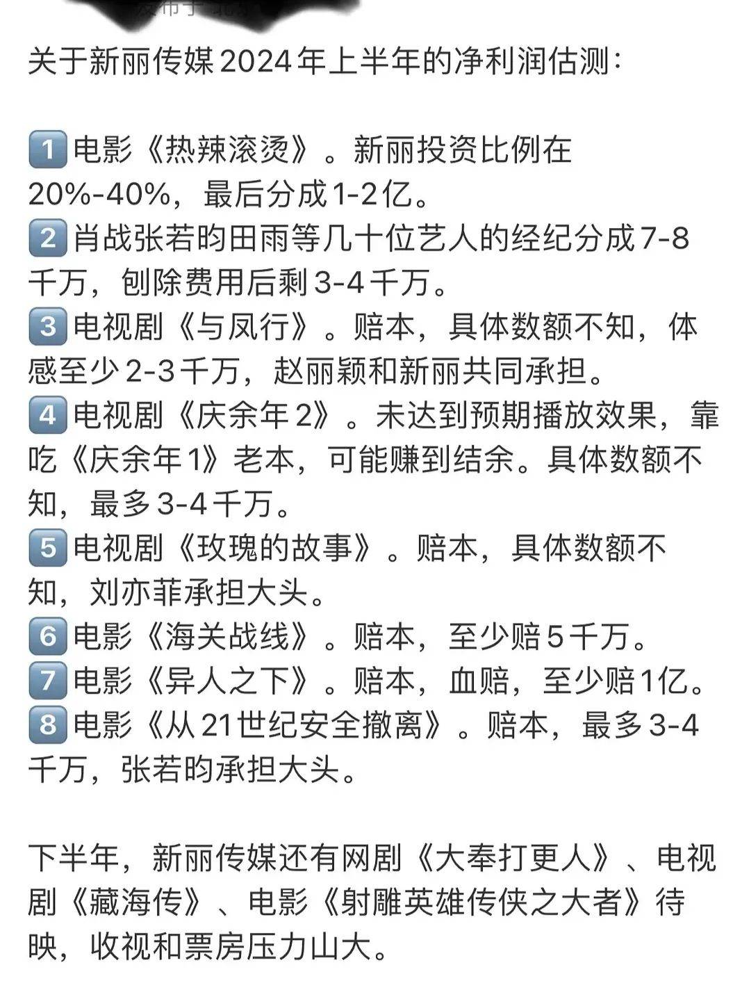 今天圈圈看到一个假瓜图,是说新丽今年投资的盈亏分析,因为太假了,但里面又有点搞笑的瓜,就单独拿出来讲。这个图最假的是说新丽投资的几部电视剧亏了,这个可太假了,新丽今年到目前为止唯一赚到钱的就是电视剧了,像与凤行肯定是赚了的,只不过对其他配角没什么大加成罢了,看林更新那些个新增的商务也知道没亏钱。搞笑的点在于,本来今年新丽赚的还挺开心的,投资的剧基本上都赚了,但偏偏压宝的电影《异人之下》一部就亏回去了,而且之前为了让投资方入股投资,和对方签了对赌需要盈利到一个数额。所以现在的压宝都变成了王鹤棣田曦薇的那部库存剧《大奉打更人》计划是今年下半年播出,这部剧被多方压宝,男女主指望这部剧飞升顶流,投资方向的指望这部剧爆了以后能完成对赌协议,王鹤棣现在被压宝挺多的,他用这部剧去贷款了新的剧,接下来会多多进组。