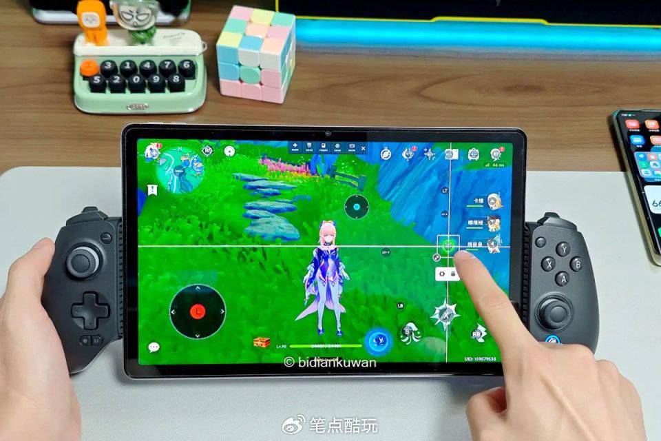 这只拉伸式手柄名为盖世小鸡G8+射手座。它不但可以夹手机,也能轻松驾驭大号平板,像下图这样夹着平板打原神,按键映射无需费心,握持手感恍如主机手柄。