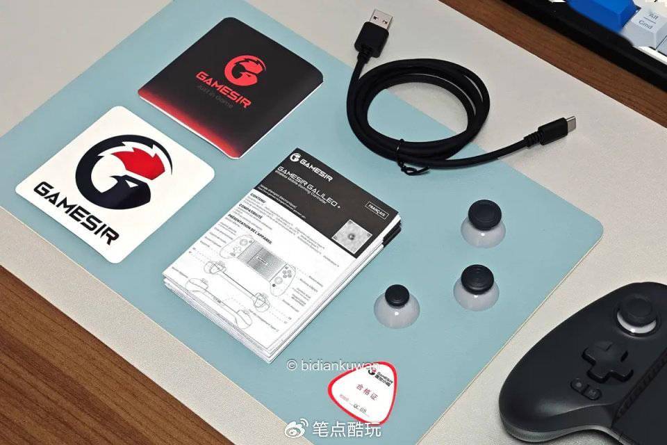 配件全家福:除箱说外,主要包括一根USB-A to C数据线和3个可替换摇杆帽。线缆可供充电或连电脑(有线模式接PC)。盖世小鸡G8+没有标配2.4G无线适配器,因此想用无线模式连电脑的话,需要另行购买。