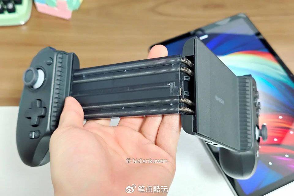 下图夹持的是联想小新Pad Plus,这款平板是11.5英寸的,横向宽度258.4毫米,看似分离的手柄两侧,实际上已经与平板牢牢合体,夹持非常稳定。