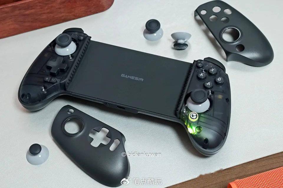 G8+对手柄小白也很友好。两侧握把的正面为磁吸式面板,可以轻松拆卸,更换摇杆、或者对调ABXY磁吸键没啥难度。拆下来是下图这个样子,通过半透明的内壳还可以隐约看到内置的摆锤震动马达。更换摇杆后扣回面板,按键摇杆依然紧固。