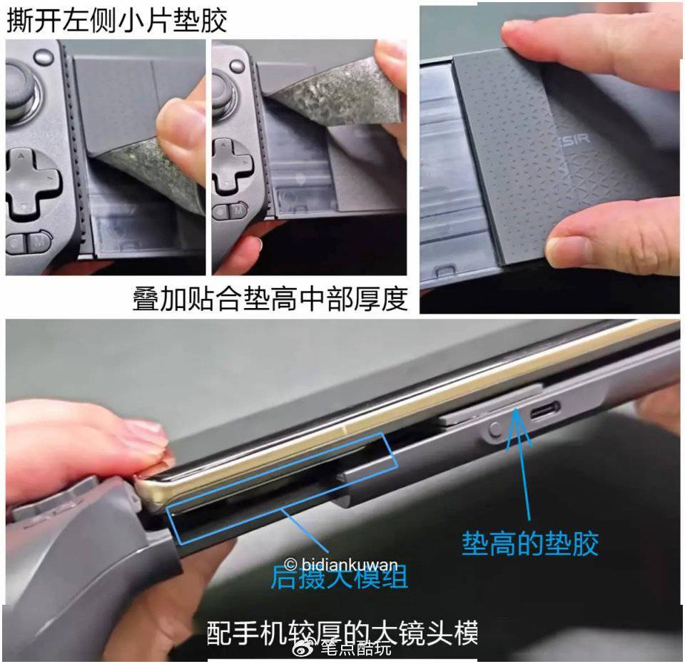 值得一提的是,G8+的夹具托板不但采用了大面积缓震防刮橡胶垫,还针对如今常见的背摄大模组手机做出专属适配——你只需像下图一样将左侧一部分可分离的胶垫撕下,垫高到旁侧,即可平衡手机镜头模组与托板支架的厚度差,保证手机夹持稳固。