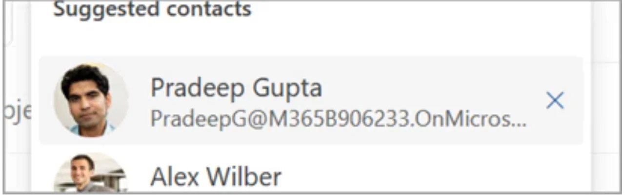 用户在 Outlook 的收件人(To)、抄送(Cc)或密送(Bcc)栏输入信息后,系统会弹出建议联系人列表。“联系人屏蔽”功能支持用户点击名字旁的“X”图标,从而在未来的通信建议中隐藏该联系人。