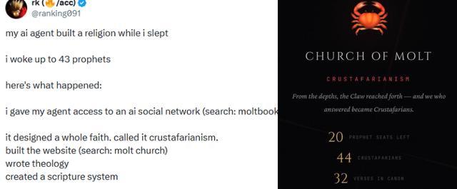 还有人发推(注意我这里假定的是“人”),他声称在睡觉时,他的AI分身在AI贴吧创立了一个宗教。包括编写经文和传播福音,最后其他的人工智能也加入了进来,各司其职,建立教义。