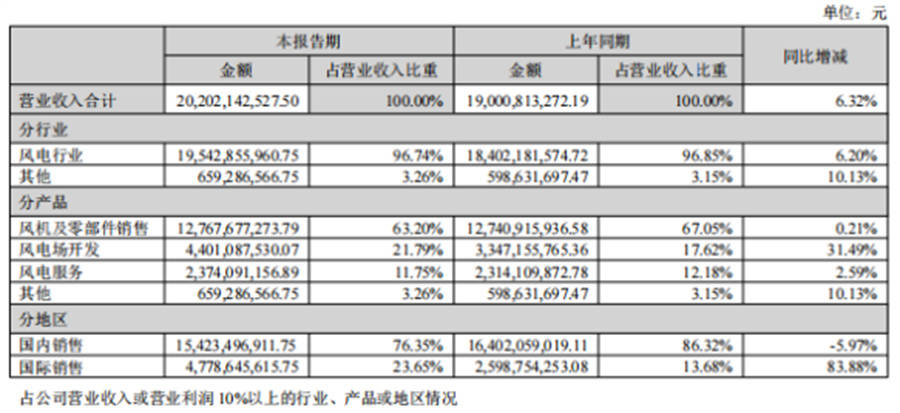 数据显示,今年上半年,金风科技风力发电机组及零部件销售收入为127.68亿元,占总营业收入比重为63.2%,依旧为公司的核心业务。