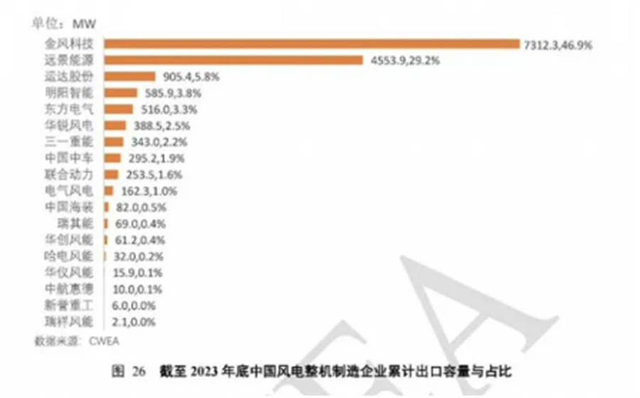 中国可再生能源学会风能专业委员会数据显示,2023年,国内有六家整机制造企业实现风机出口,它们分别向18个国家出口了风电机组。其中,金风科技出口量最多,其风机出口到了13个国家,共327台,总容量为1.70GW。今年上半年,金风科技的海外订单量有有所增长,为5.17GW,同比增长了12.44%。