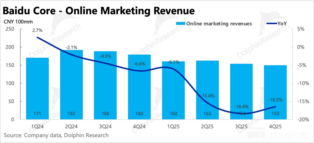 2025年,百度手机App月活用户跌至6.79亿,已经连续两个季度下滑。据海豚投研数据,传统搜索广告第四季度同比下滑26%,虽较上季度的30%降幅有所收窄,但难以判断是上季度的低基数影响还是真实回暖,正增长何时恢复仍不明朗。