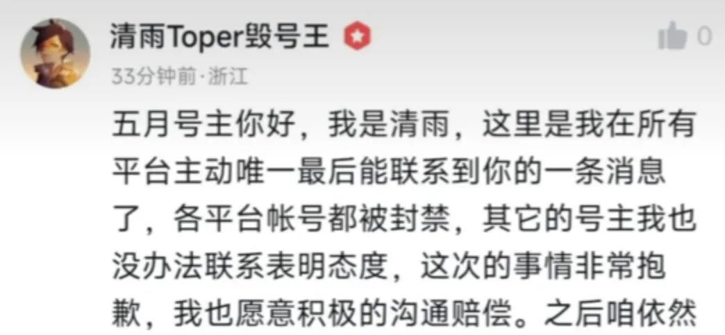 并且明确表示:再来一遍依然会毁号,自己没有做错什么,绝对不会道歉。