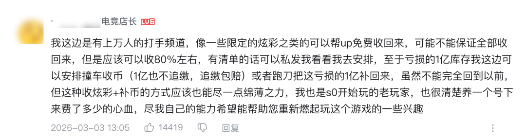 有感同身受的玩家、电竞俱乐部店长,表示愿意免费为号主补回部分损失。