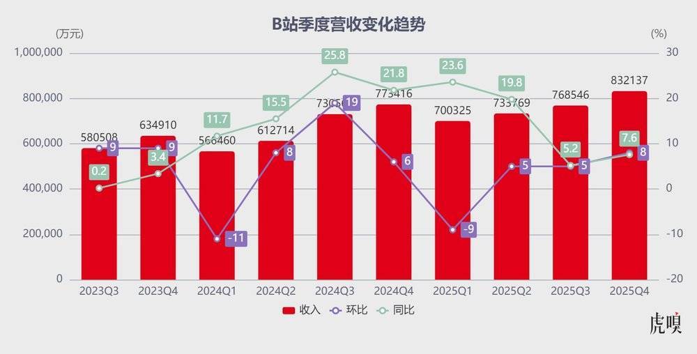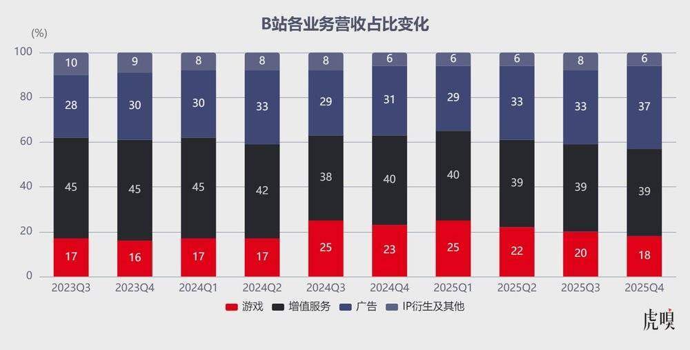 财报显示,2025Q4 B站增值服务收入 32.6 亿元,同比增长 6%;全年收入 119.3 亿元,同比增长 8%,在总营收中占比达 39%,仍是 B 站第一大收入来源。