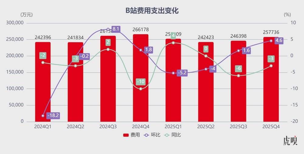 财报清晰展现了 B 站在成本管控上的成果:2025Q4 B 站营业成本 52.4 亿元,同比仅增长 6%,低于 8% 的营收增速;经营开支 25.8 亿元,同比下降 3%,其中销售及营销开支 11.3 亿元,同比减少 9%,研发开支保持 9.21 亿元,实现了“降本不降核心投入”的精准管控。