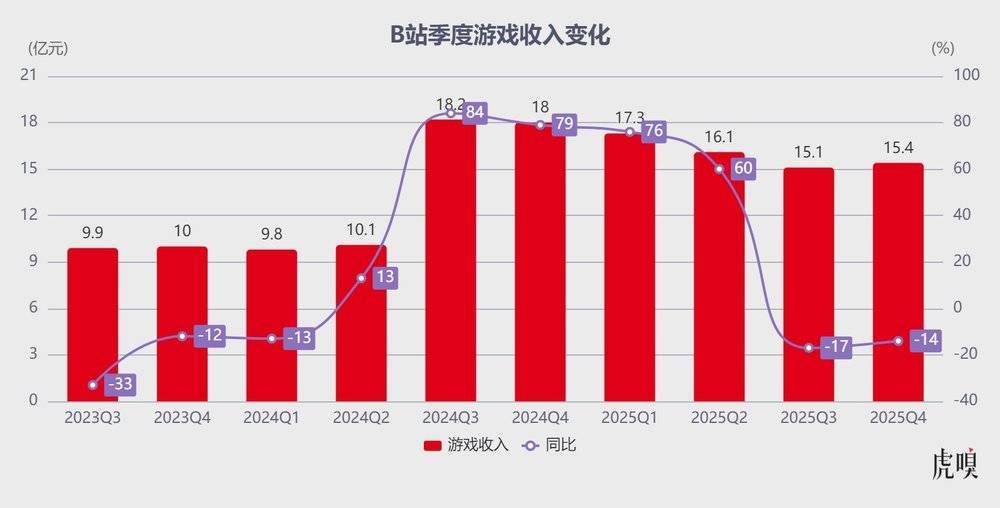 不过,2025 年 B 站游戏收入却呈季度下滑的态势:从一季度的 17.31 亿元,降至二季度的 16.1 亿元、三季度的 15.1 亿元,第四季度微增至 15.4 亿元,增长动能明显减弱。