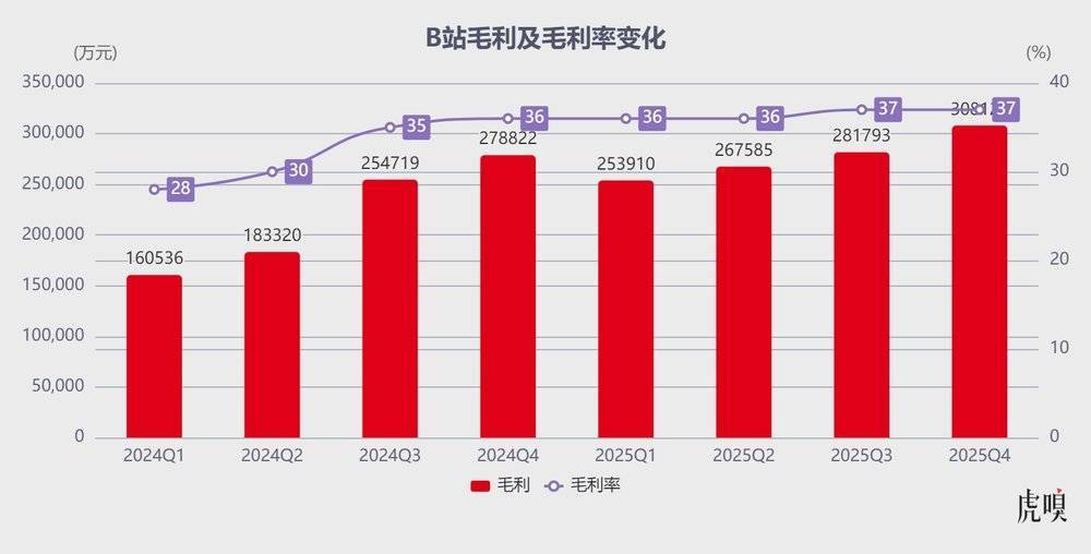 单季度来看,2025Q4 B 站总营收 83.2 亿元,同比增长 8%;净利润 5.1 亿元,同比大幅提升 478%;毛利率连续 14 个季度环比提升至 37%,调整后运营利润率升至 10%,稳步向 15%-20% 的中期目标迈进。