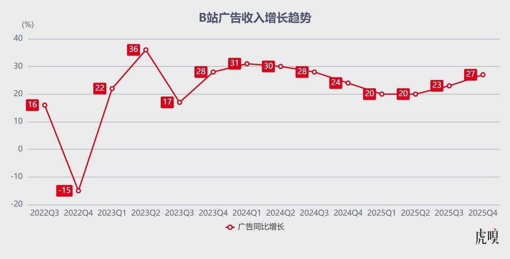 财报显示,2025Q4 B站广告收入 30.4 亿元,同比增长 27%,连续 12 个季度保持同比高速增长;全年广告收入突破 100.6 亿元,同比增长 23%,在总营收中占比提升至 37%,成为仅次于增值服务的第二大收入来源。