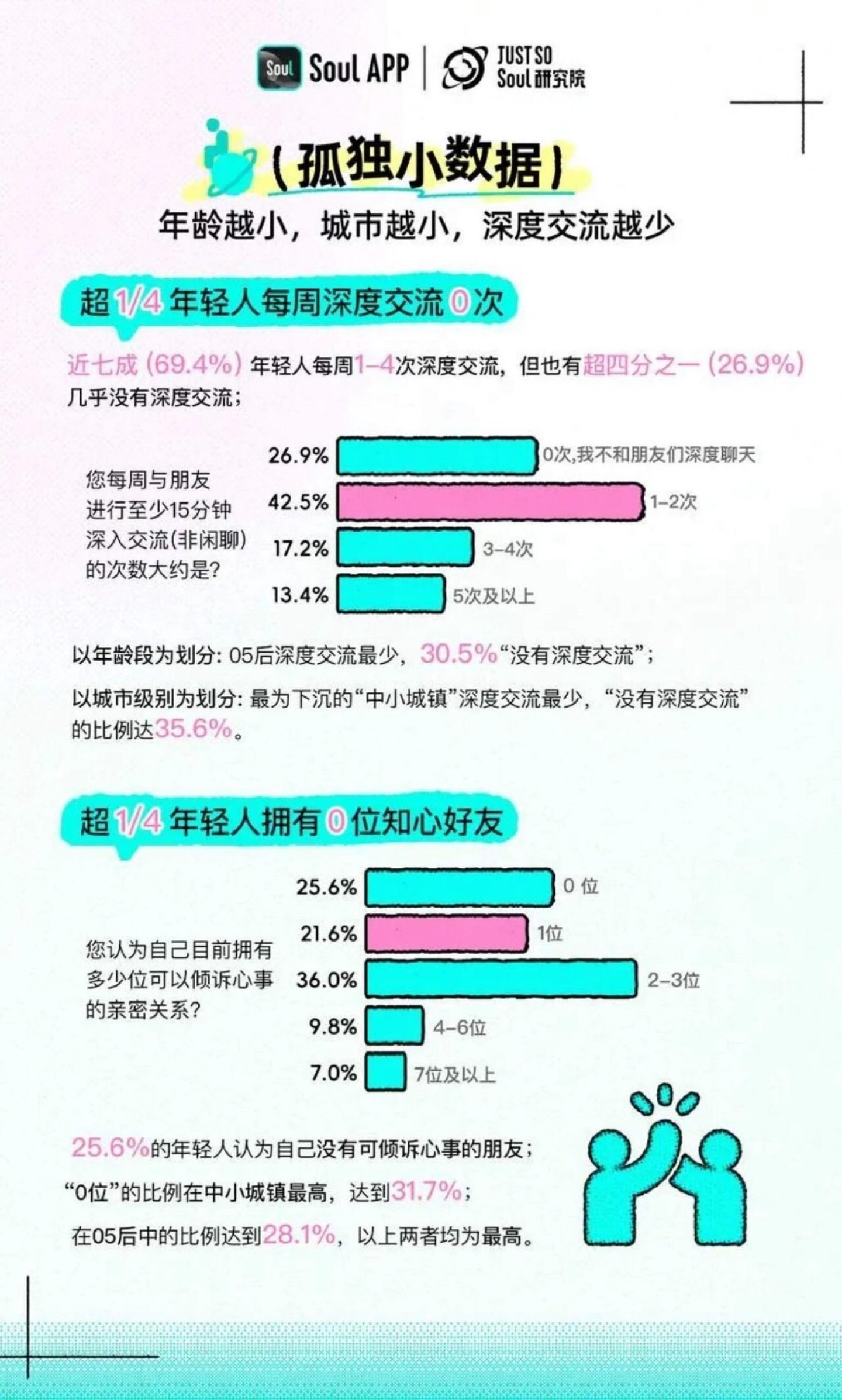 JUST SO Soul研究院去年发布了《2025年Z世代孤独指数报告》,数据显示,超40%的Z世代日常孤独感爆棚,35%宁愿独扛挫折,30%主动回避社交。