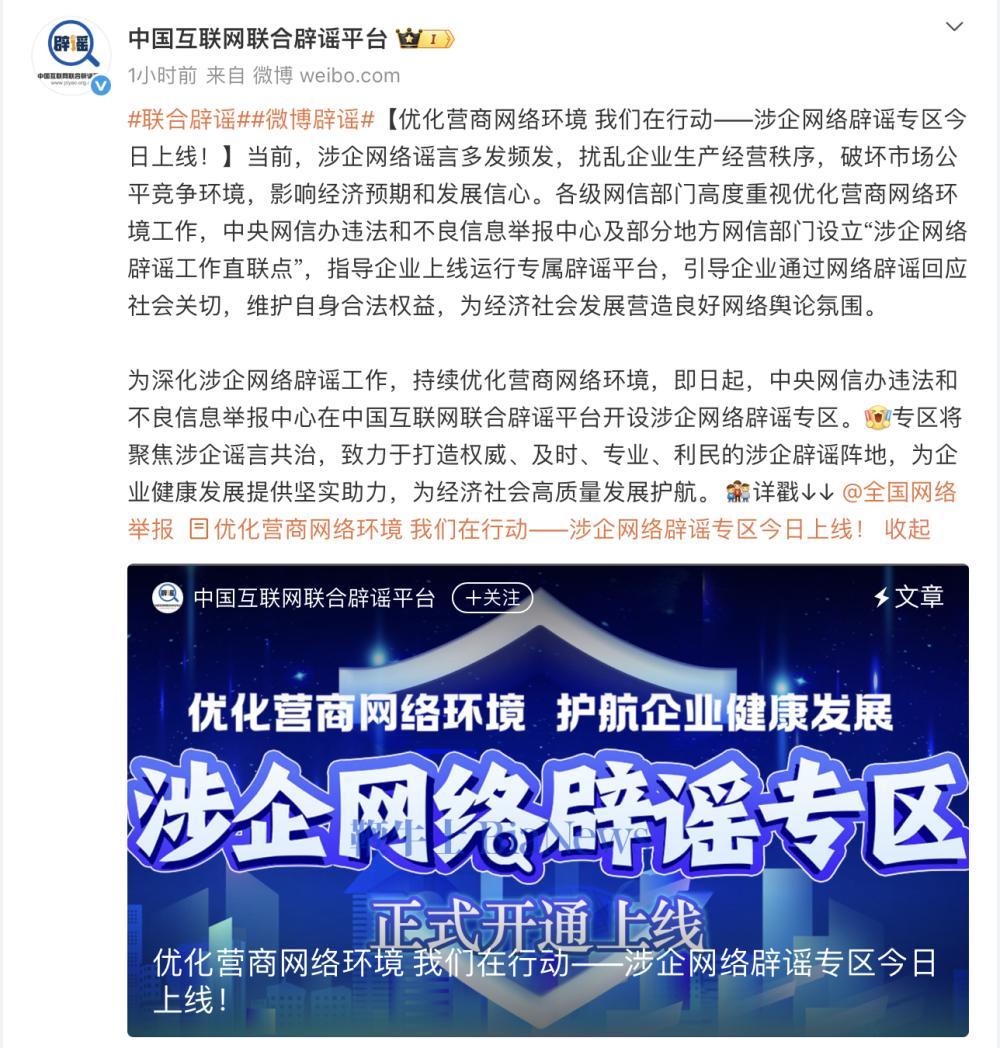3月15日,中国互联网联合辟谣平台宣布,为深化涉企网络辟谣工作,持续优化营商网络环境,即日起,中央网信办违法和不良信息举报中心在中国互联网联合辟谣平台开设涉企网络辟谣专区。