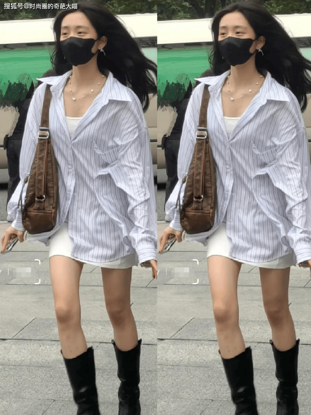 条纹衬衫搭配靴子。正在小跑中的多多腿好细,气质满分。黄多多还真有种吾家有女初长成的感觉。