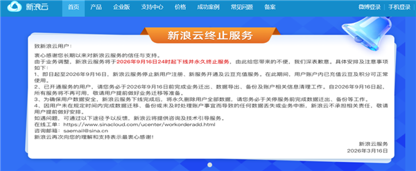 快科技3月18日消息,据新浪云服务团队官方公告,由于业务调整,新浪云服务将于2026年9月16日24时起下线并永久终止服务。