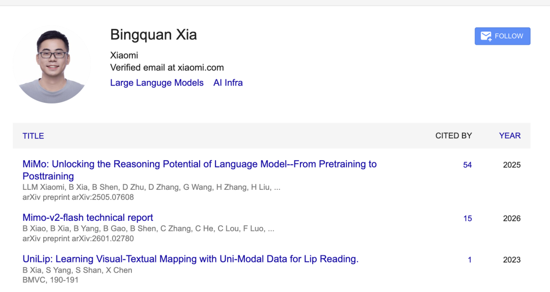 Bingquan Xia,MiMo-V2-Flash 核心作者之一,中科院计算技术研究所2021届研究生。