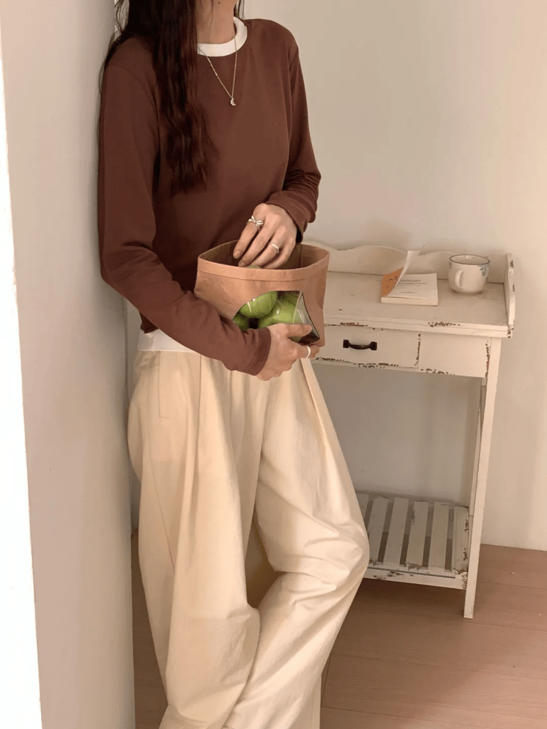 这样一件打底衫随随便便搭就很美,初秋温度适宜,单穿一件自带精致简约感。