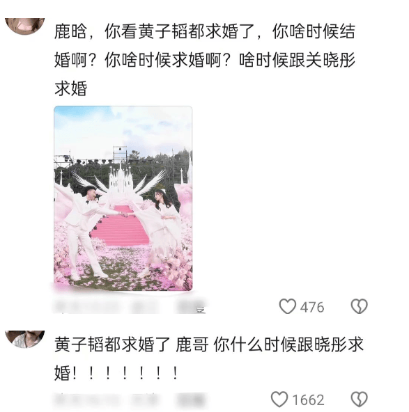 很快,鹿晗的评论区已经沦陷,不少网友跑去留言催婚,希望他也能抓紧时间去跟关晓彤求婚。