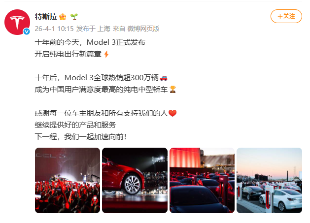 4月1日,特斯拉官方微博发布Model 3发布十周年纪念内容。截至目前,Model 3全球累计销量已超300万辆,并获评中国用户满意度最高的纯电中型轿车。