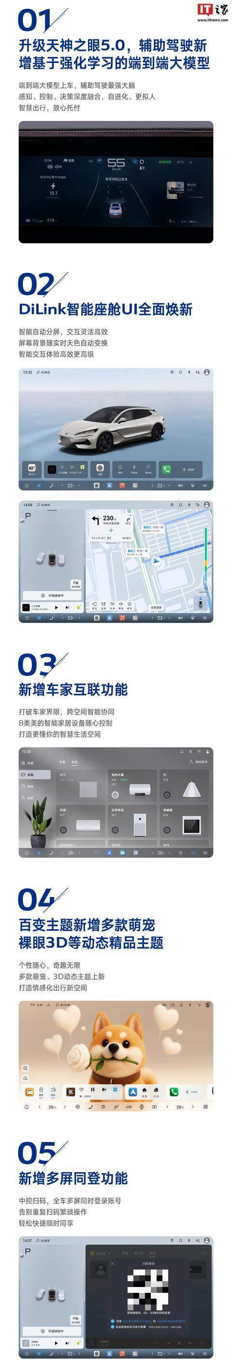 Dilink 智能座舱 UI 焕新:支持智能自动分屏,屏幕背景可随实时天色自动变换,智能交互体验高效更高级。