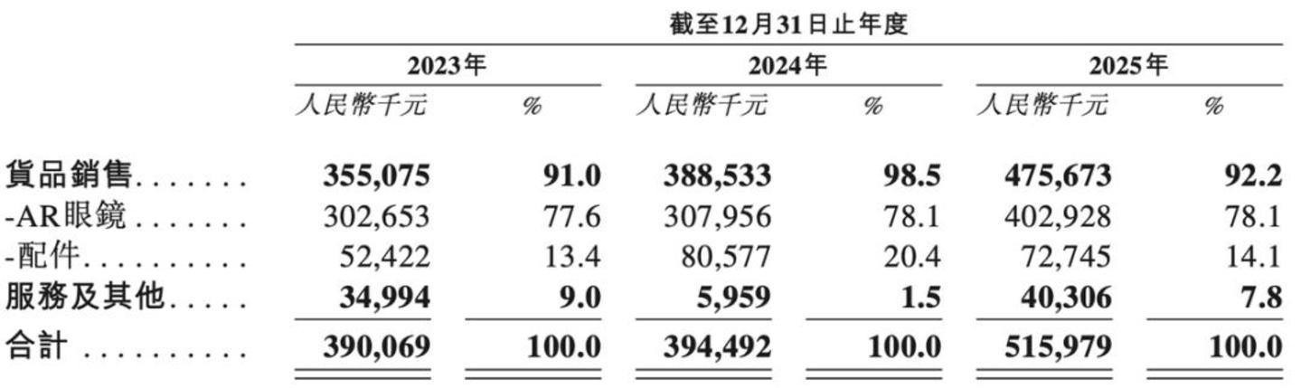 招股书显示,2025年XREAL货品销售收入占比达92.2%,其中AR眼镜贡献78.1%的营收,而服务及其他收入占比仅7.8%。