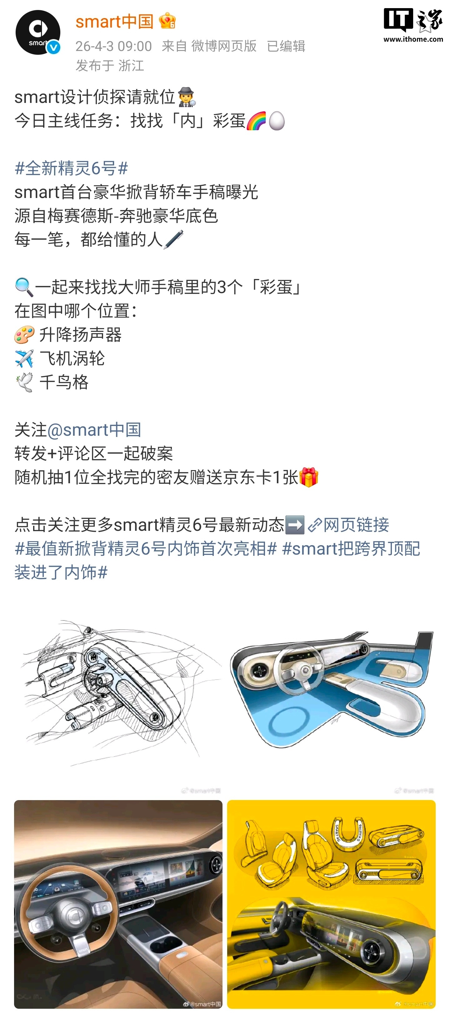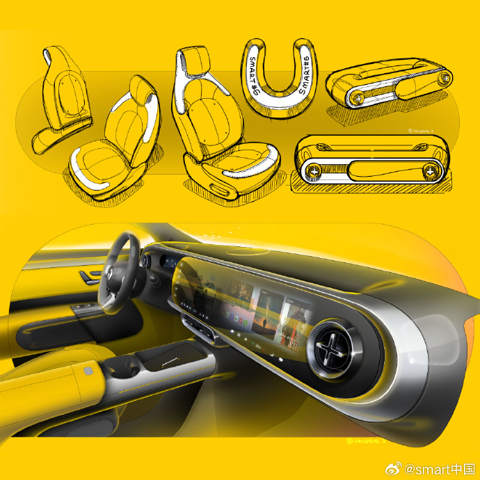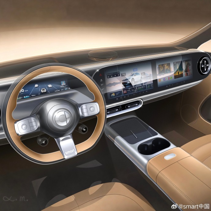 IT之家 4 月 5 日消息,smart 今日公布旗下首台豪华掀背轿车内饰手稿,号称“源自梅赛德斯-奔驰豪华底色”。手稿中有三个“彩蛋”,分别为升降扬声器、飞机涡轮、千鸟格。