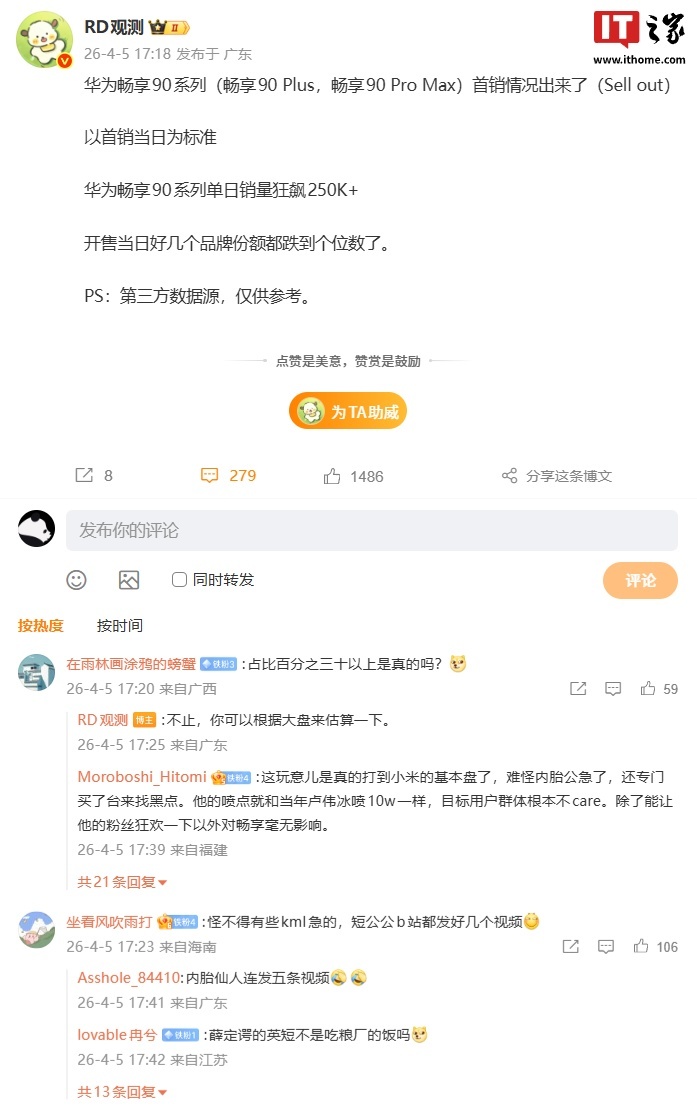 IT之家 4 月 5 日消息,长期关注国内手机市场份额的博主 @RD观测 今日分享了华为畅享 90 系列(含畅享 90 Plus 和畅享 90 Pro Max)首销情况(第三方数据源,仅供参考)。