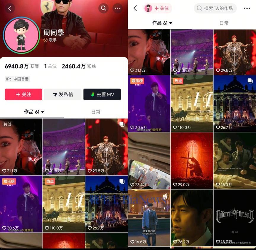 去年7月,周杰伦官宣入驻抖音平台时,曾一度带动巨星传奇股价盘中大涨超162%。截至目前,周杰伦认证账号“周同学”共发布61条视频,粉丝数量高达2460.4万。